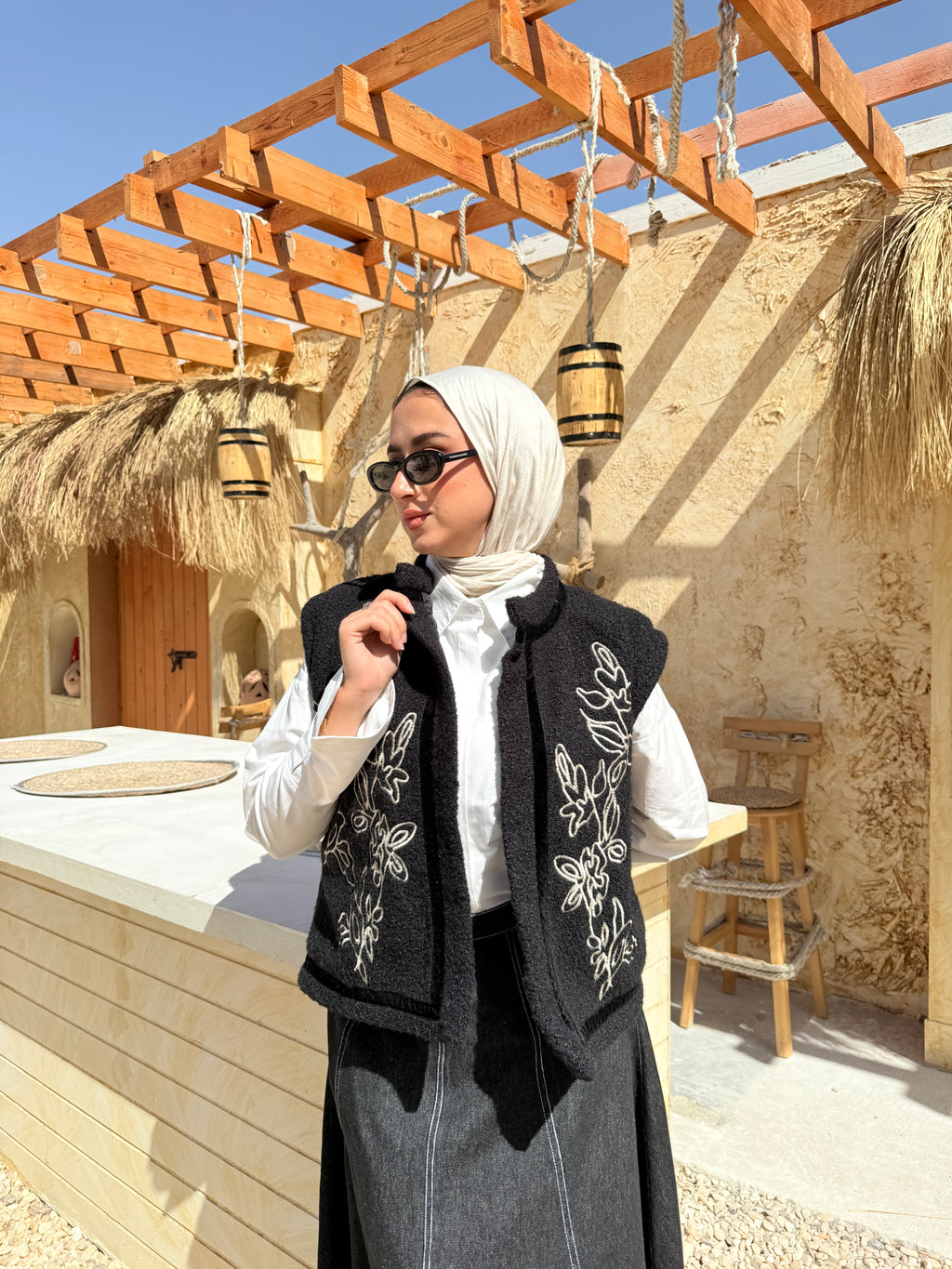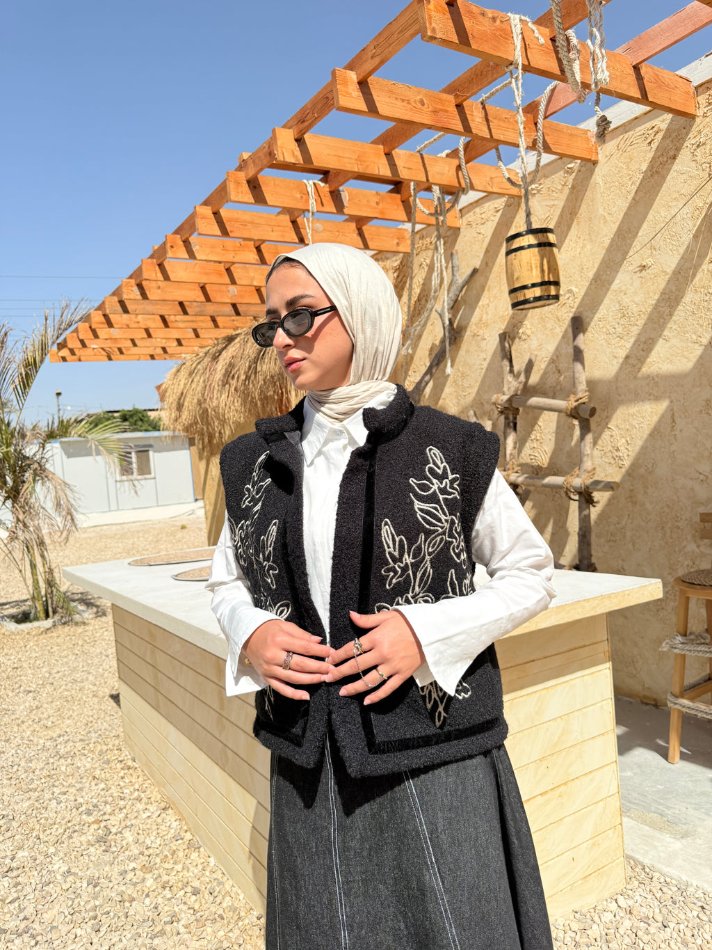 Embroidery Fur Vest - Black