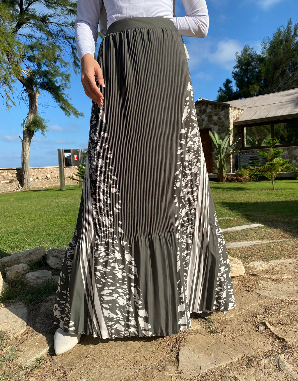 Printed Accordion Crepe Skirt - Olive